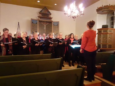 Asdal Kirke var næsten fyldt med glade mennesker, der nød Bjergby-Mygdal kirkers voksenkor synge og spille deres jule-program.
